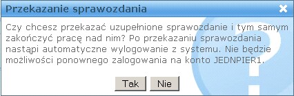 Potwierdzenie przekazania sprawozdania spowoduje wylogowanie użytkownika po zakończeniu operacji. Po wypełnieniu i przekazaniu sprawozdania do jednostki nadrzędnej, ponowne zalogowanie się do aplikacji nie będzie możliwe. Ponowne zalogowanie do aplikacji będzie możliwe tylko w sytuacji cofnięcia przekazania sprawozdania przez jednostkę nadrzędną. |